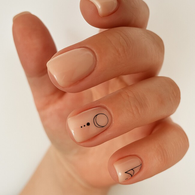 Геометрический нейл-арт на коротких ногтях — это тонкая вертикальная полоска, одна точка или небольшой прямоугольник в углу пластины. Ничего больше. На маленьком формате детали умножаются: чем больше элементов — тем перегруженнее выглядит ноготь. Поэтому современные мастера придерживаются правила одного акцента на пластину — и оно работает.