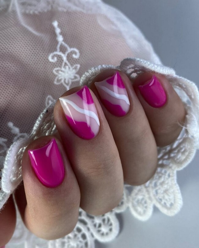 Приглушённый розовый маникюр на коротких ногтях держится в рамках нюдовой палитры и не выглядит кричаще. Фуксия или малина — уже другая категория: их используют как акцентный цвет на одном-двух ногтях или для летнего маникюра, где контраст уместен.