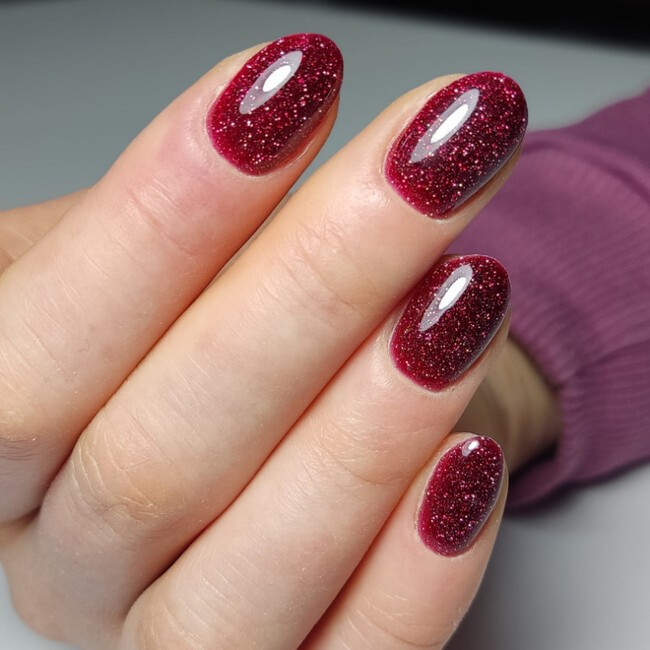 Тёмный бордовый — цвет 2026 года по версии редакции Barb.ua. На коротких ногтях он выглядит аккуратно: тёмный оттенок уменьшает визуальный размер пластины, поэтому ноготь кажется более узким и длинным. Вишнёвый и гранатовый дают похожий эффект — их отличие в подтоне: вишня холоднее, гранат — теплее.