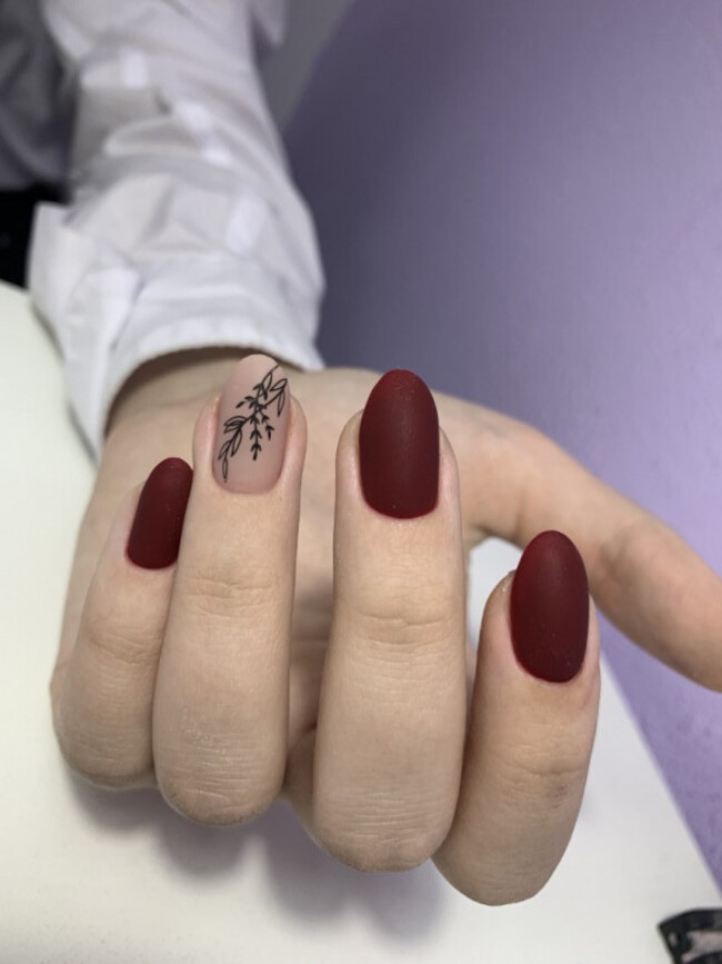 Короткие ногти с тёмно-красным лаком хорошо сочетаются с матовым топом — он снимает излишний блеск и делает цвет глубже.