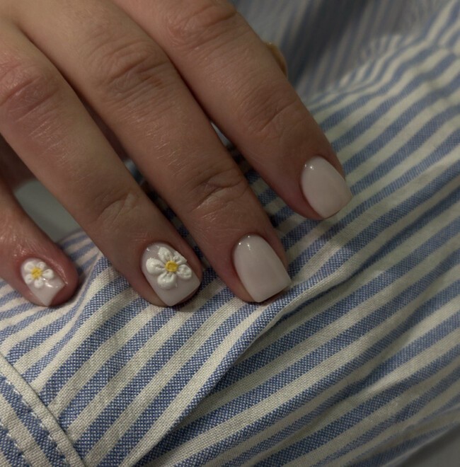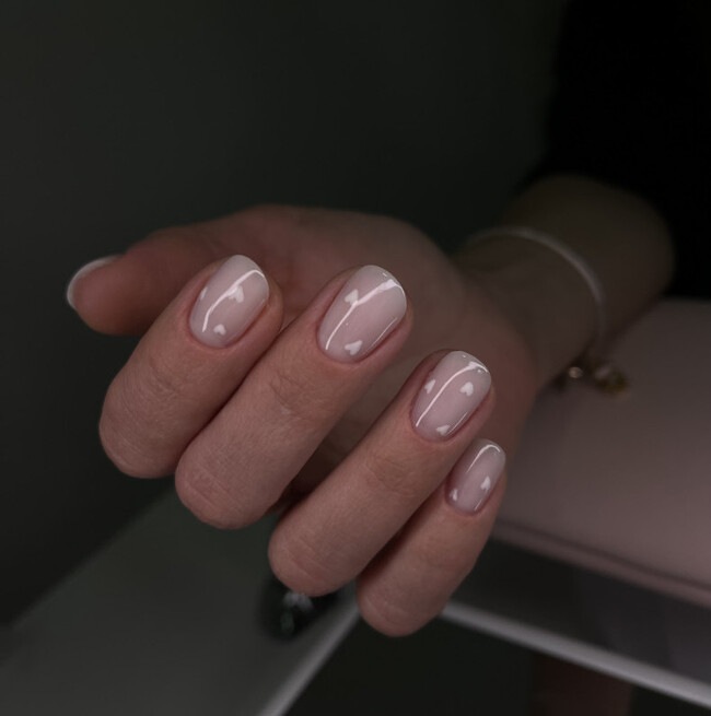 Молочный цвет — это тёплый белый с желтоватым или кремовым подтоном. На коротких ногтях он визуально добавляет аккуратности без контраста с кожей. Нюдовый оттенок подбирается индивидуально под тон руки: слишком светлый будет выглядеть как ноготь без лака, слишком тёмный — как отдельный цвет. Задача — найти оттенок, который идёт «от пластины».