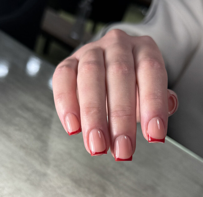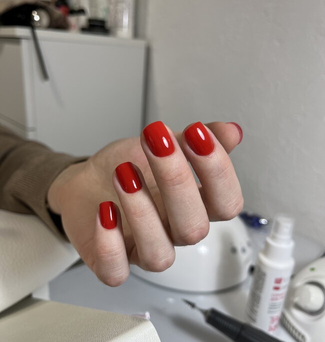 Трендовый красный маникюр в 2026 году — это не яркий томатный, а тёмные, насыщенные оттенки: вишня, бордо, виноград, гранат. На короткой пластине такие цвета выглядят сдержанно — благодаря тому, что площадь небольшая и цвет не «кричит». Мягкий квадрат или овал усиливают этот эффект: ноготь выглядит аккуратно, а не резко.