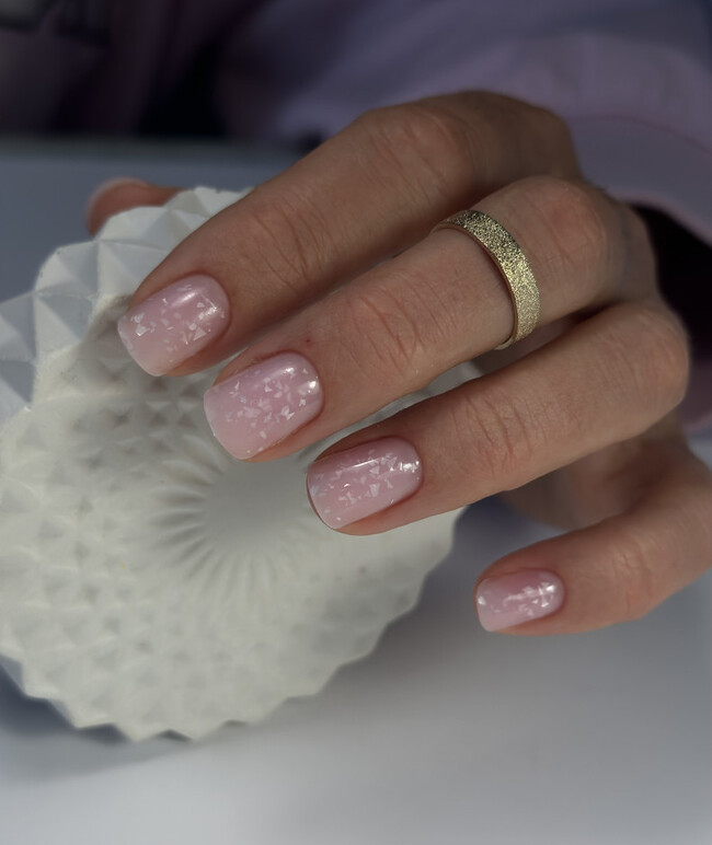 Glass Nails — полупрозрачное покрытие с едва уловимым перламутровым или желейным блеском. Эффект напоминает мокрое стекло или капельку воды на ногте. Технически это достигается через специальные гели с минимальным пигментом или через сочетание прозрачной базы с мелким глиттером-голографиком. На микро-ноготках этот эффект читается чётко — он не требует длины, чтобы «раскрыться».