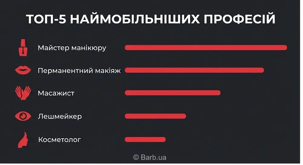 - Мобильность профессий: Мастера маникюра и перманентного макияжа — самые мобильные специалисты.