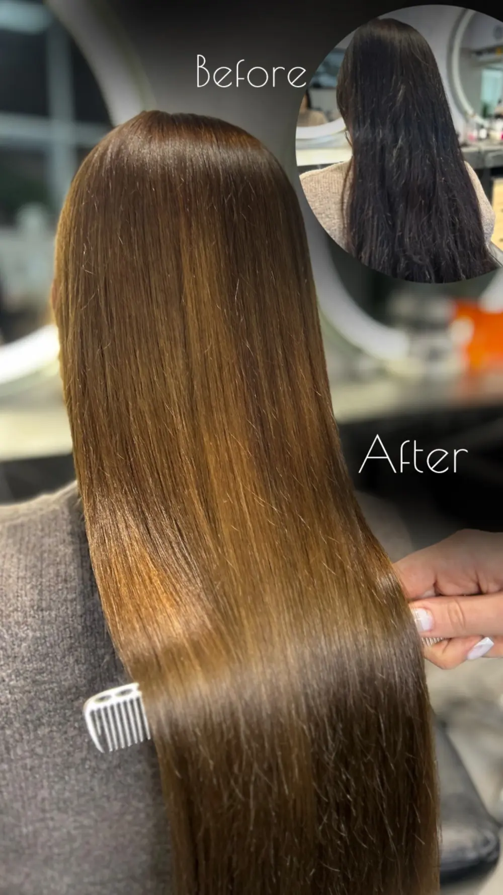 Просматривая портфолио, обратите внимание на несколько моментов: показывает ли мастер реальные фото «до» (а не только идеальный результат «после»), выглядят ли волосы здоровыми после процедуры, есть ли примеры работ, похожих на ваш случай.