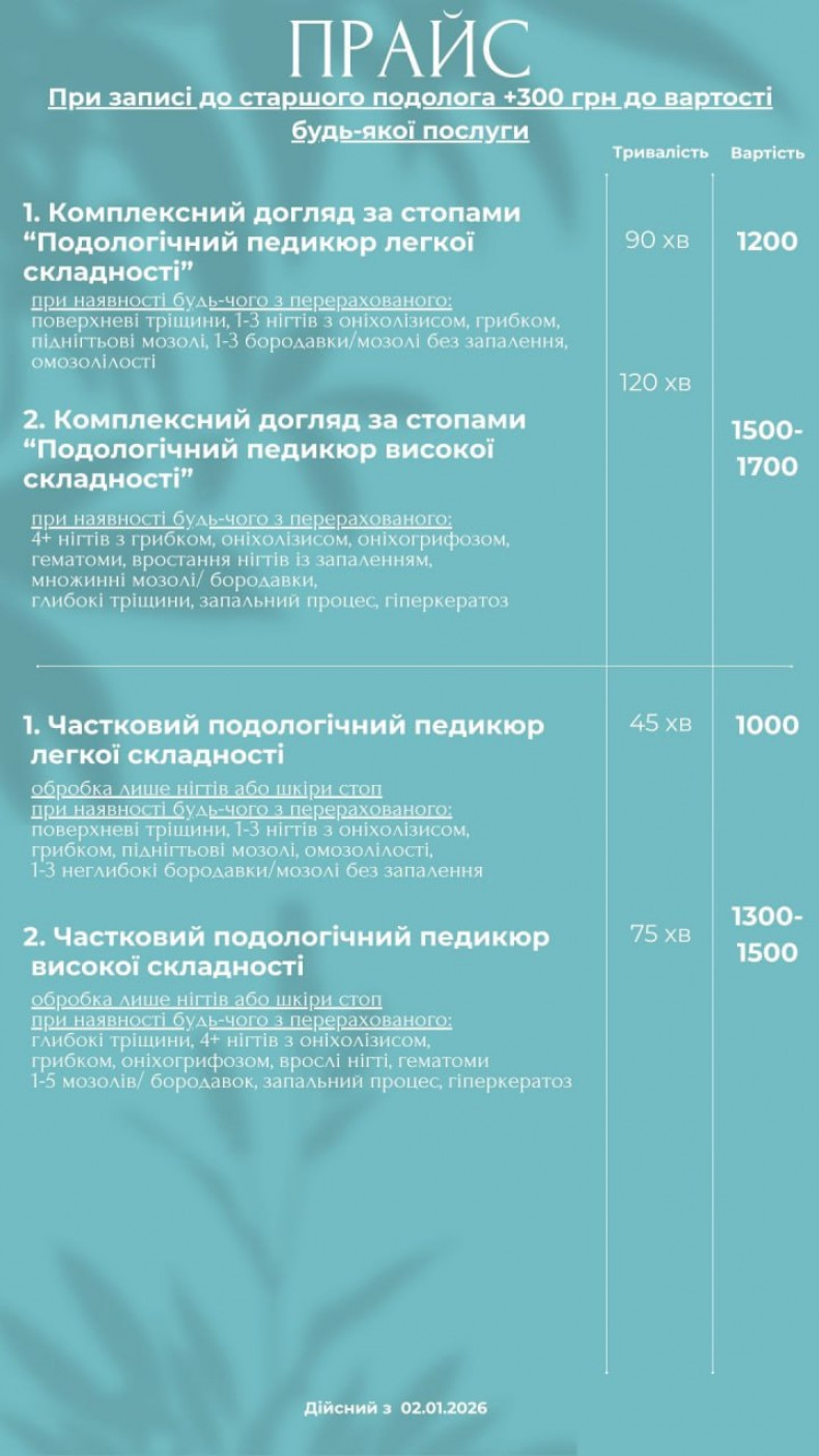 | Медицинский педикюр | от 1200 грн. / 90 мин |