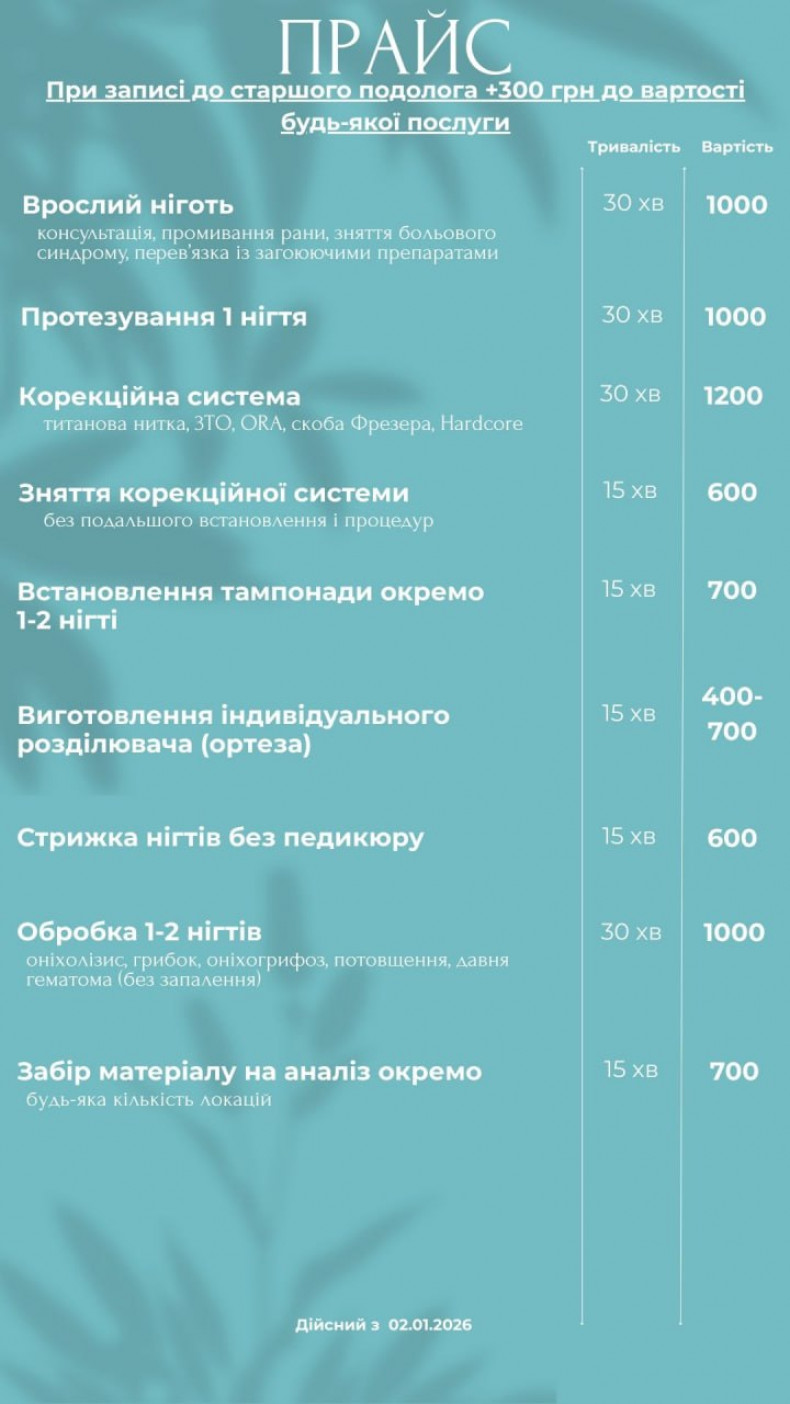 | Лечение вросшего ногтя | 1000 грн. / 30 мин |