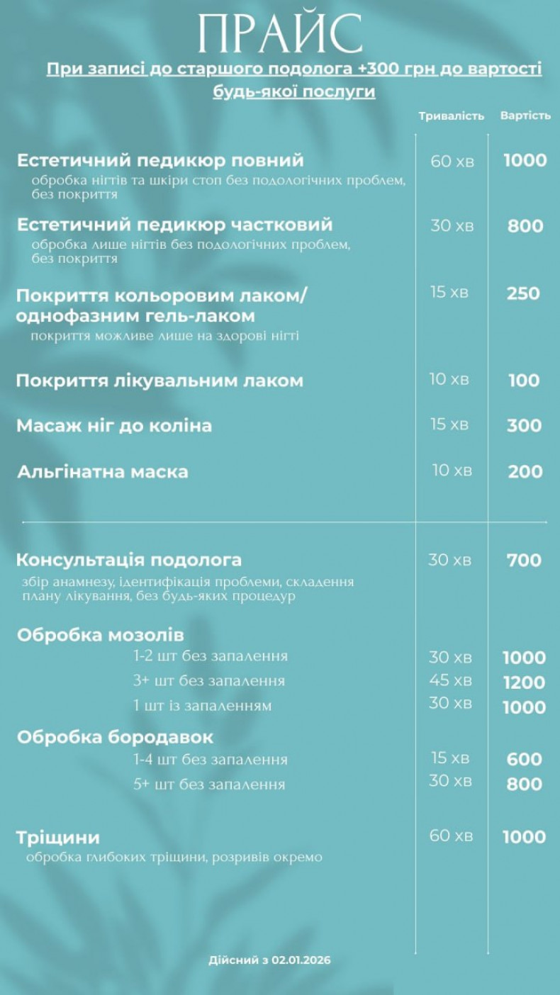 | Удаление мозолей | от 1000 грн. / 30 мин |