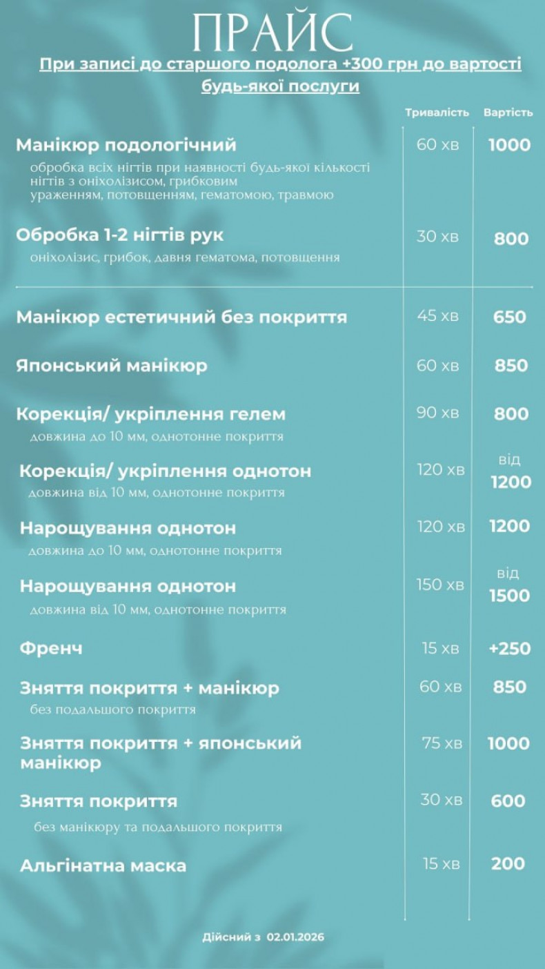 | Педикюр | 1000 грн. / 60 мин |