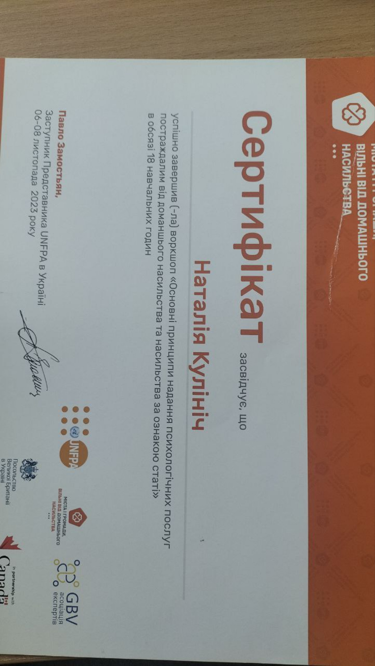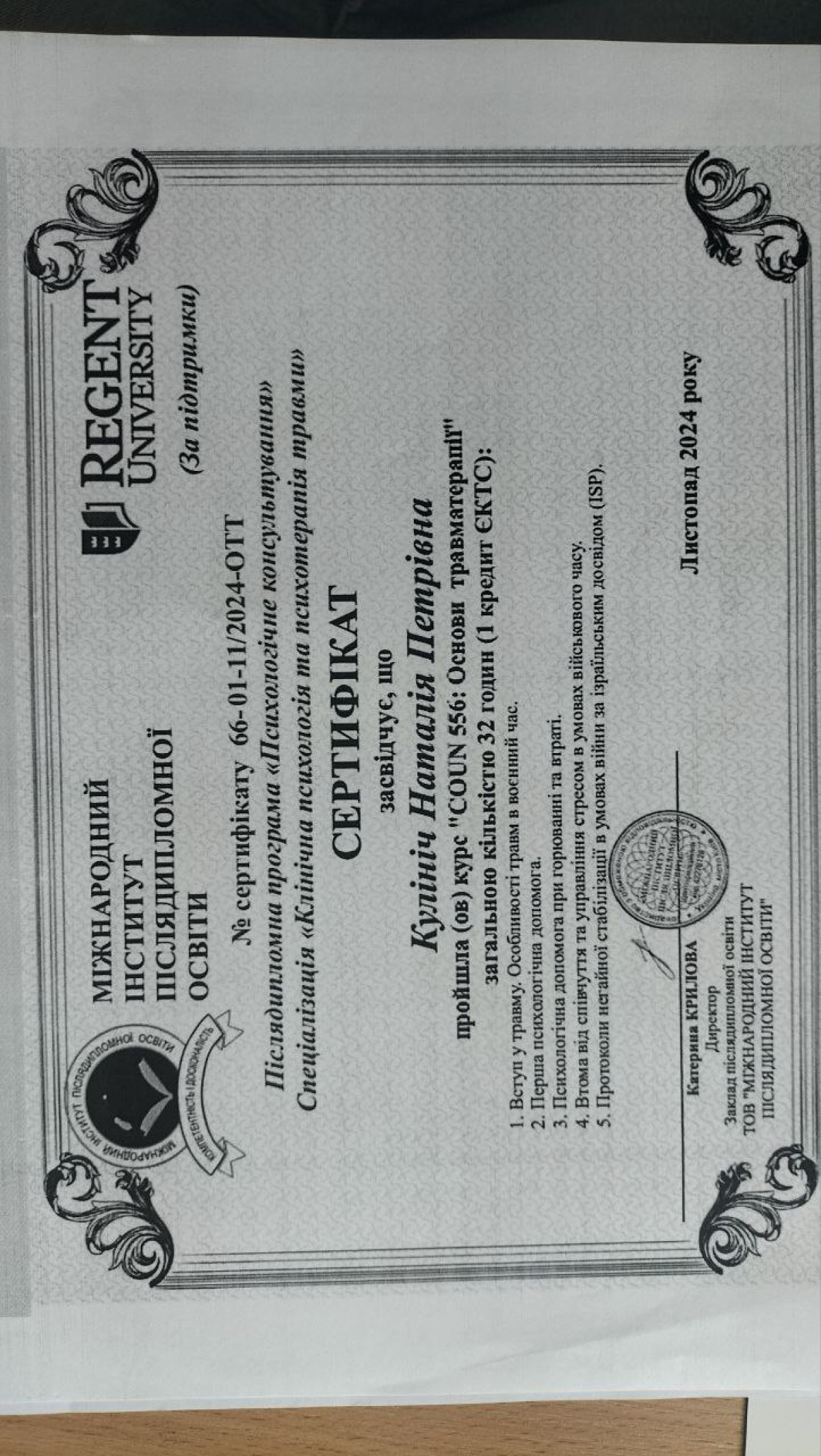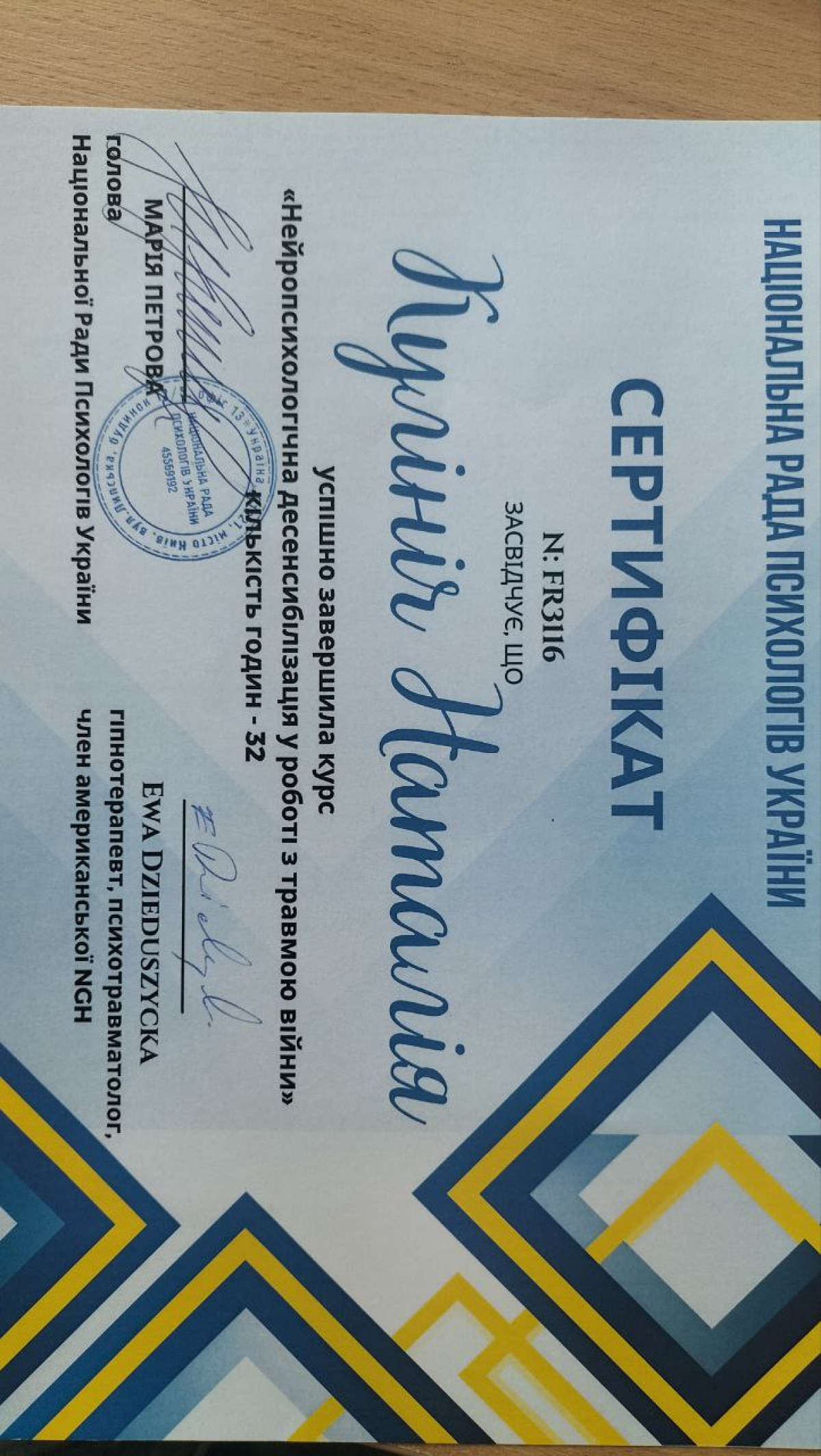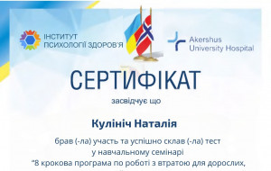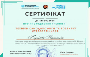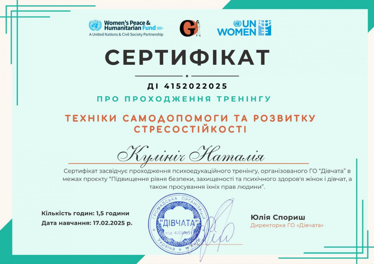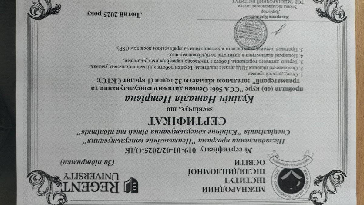 Постійно вдосконалюю свої знання та навички, походячи спеціалізовані курси, тренінги та навчання. Моя мета - створити безпечний, підтримуючий простір, де кожен зможе знайти розуміння, опору й шлях до змін.