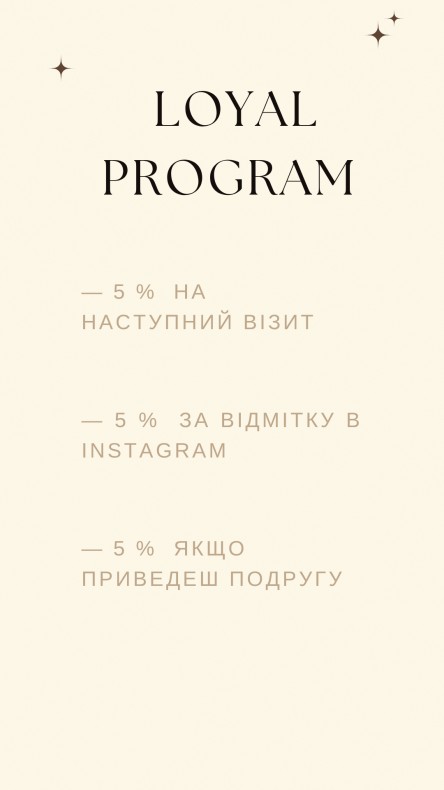 Знижка 5 % на будь- яку зачіску , якщо ви відвідуєте повторно , якщо ви відмітили мене в соцмережах або привели подругу .