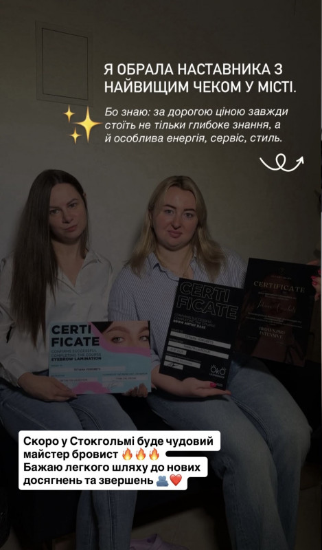 | Документ об окончании | Сертифікат від мене на 2х мовах та сертифікат бренду OkO lash&brow |