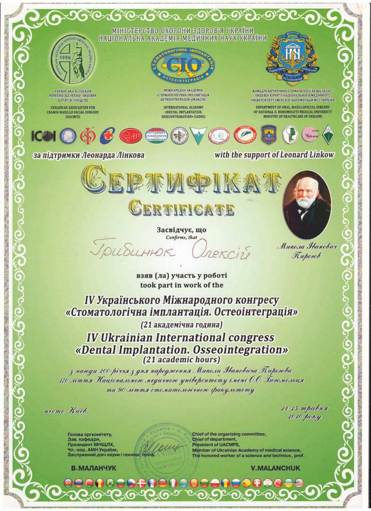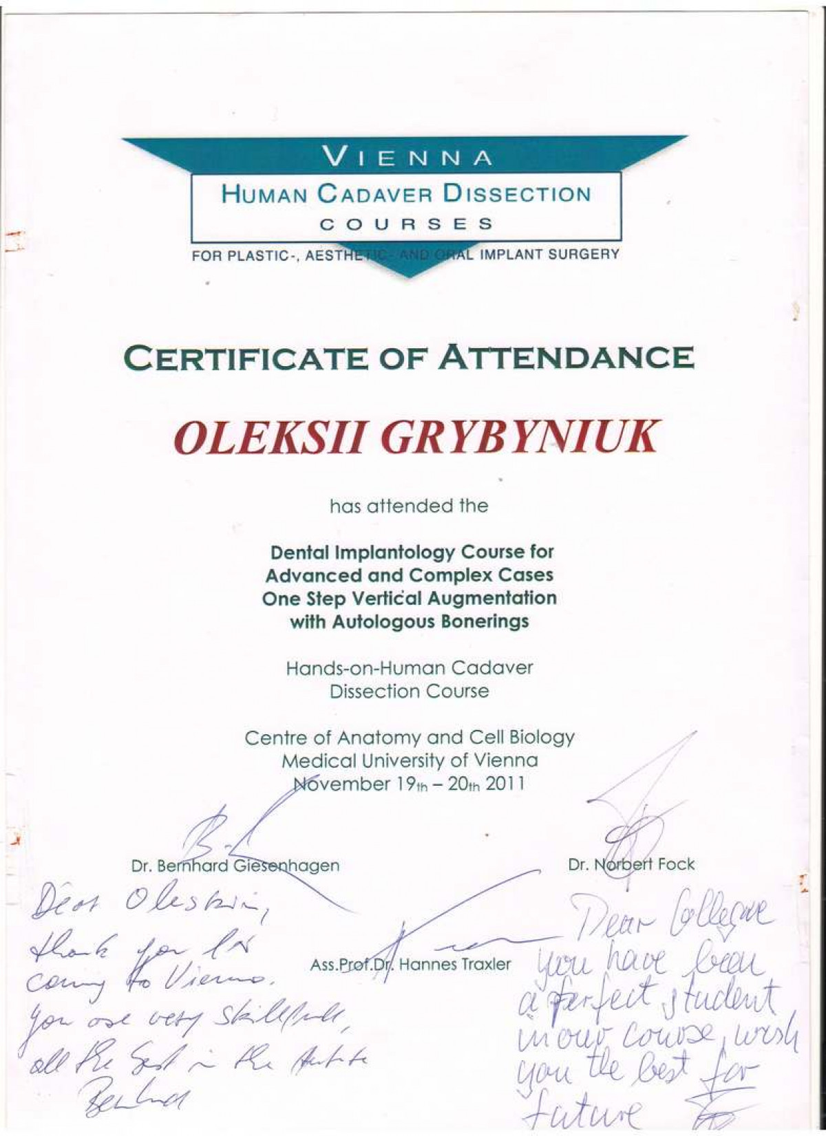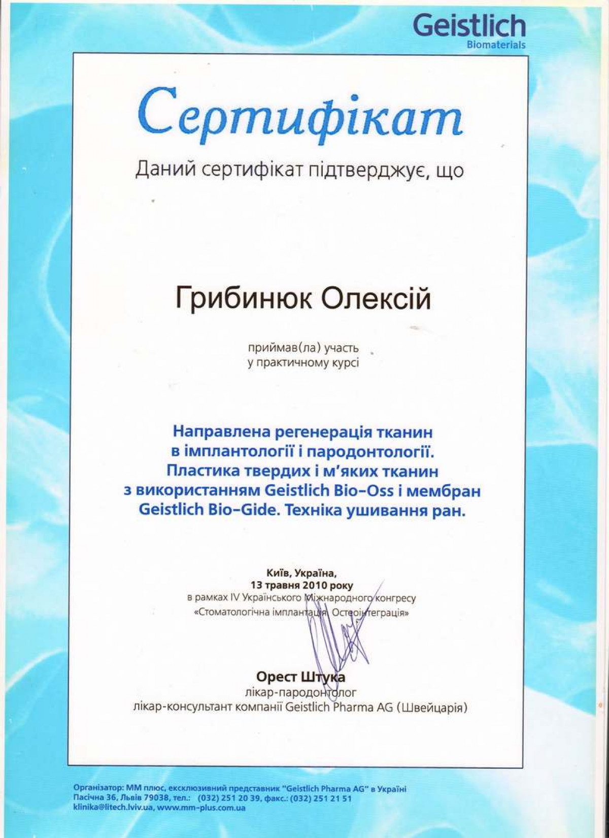 Проходил обучение и стажировку в учебных и клинических центрах Израиля, Германии, Италии, Австрии, Швейцарии, Украины.