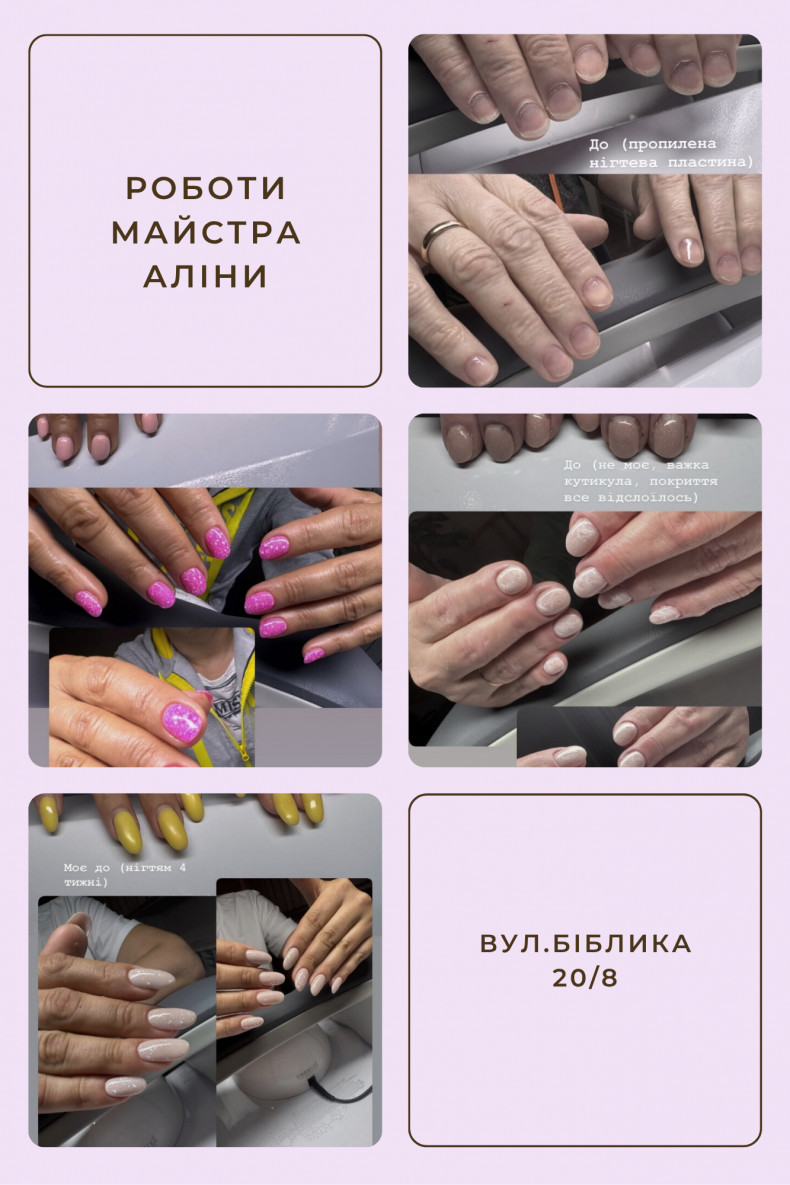 В нашому кабінеті можна зробити Манікюр з покриттям гель-лак. Японський манікюр. Діп-система ( гіпоалергенне покриття без лампи). Нарощування нігтів: довжина 1-2, 3-4. Викладний френч.