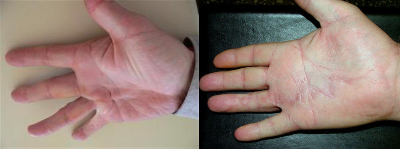 1я степень – формирование ганглиобразных утолщений ладонного апоневроза. На этой стадии движения в пальцах кисти не ограничены.