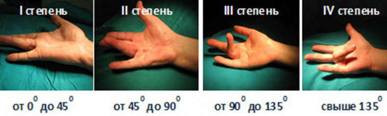 В развитии заболевания выделяют 4 степени, в зависимости от выраженности ограничения разгибания пальцев