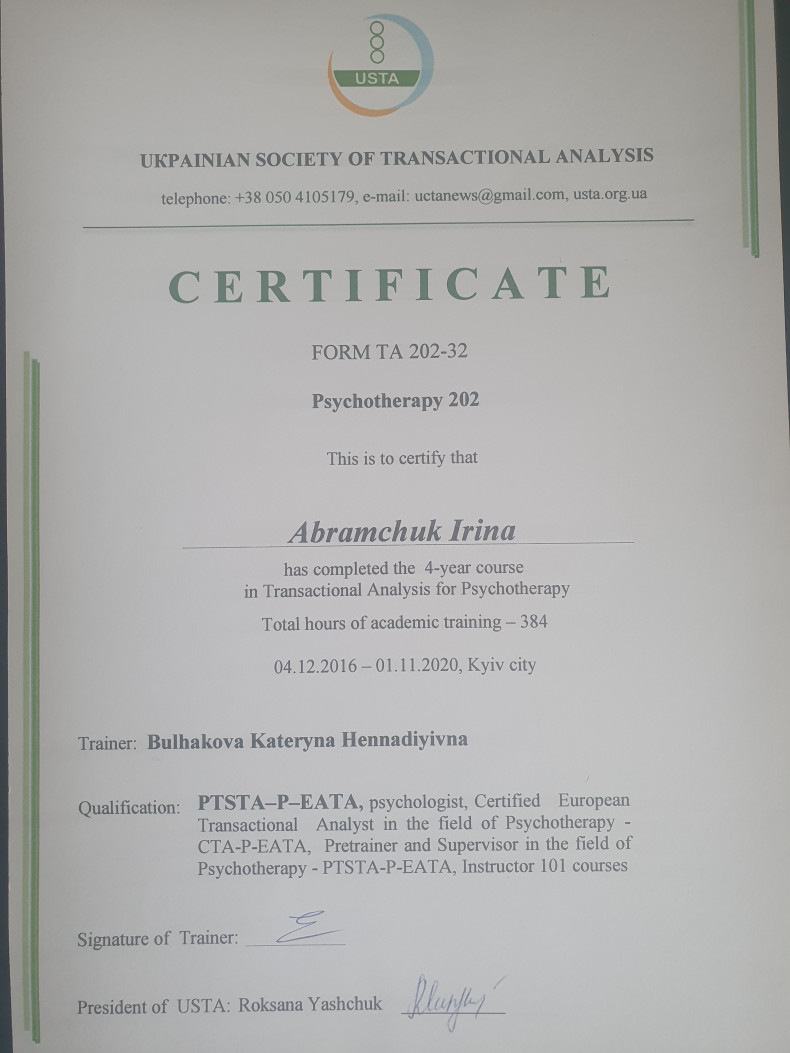 Здравствуйте! Меня зовут Ирина Абрамчук! Я психолог, имею дополнительную специализацию по психотерапии ( метод - Транзактный анализ).
