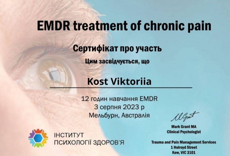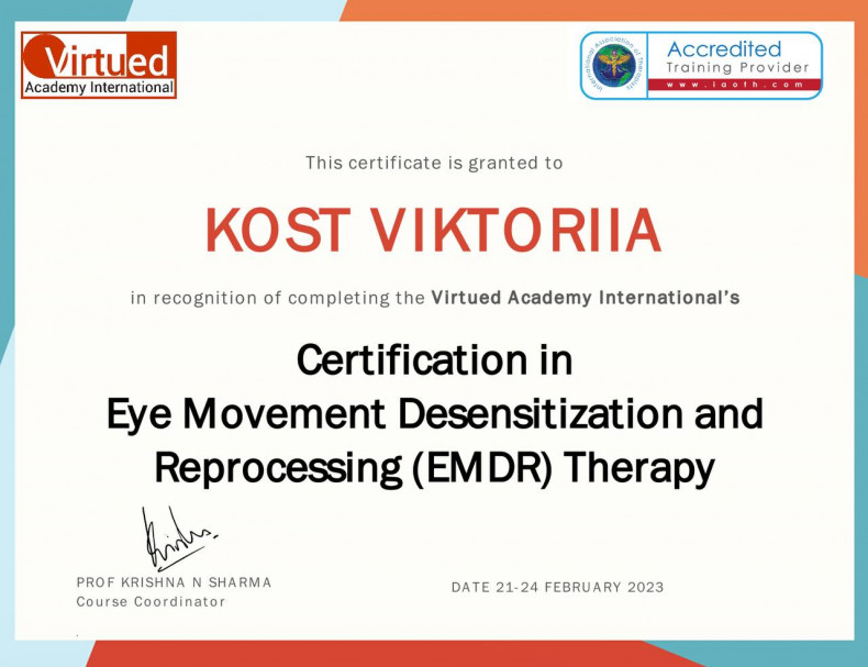 - Травматерапія : ПТСР, досвід насилля, стихійні лиха, травма в наслідок війни, сексуалізоване, фізичне, емоційне насилля.