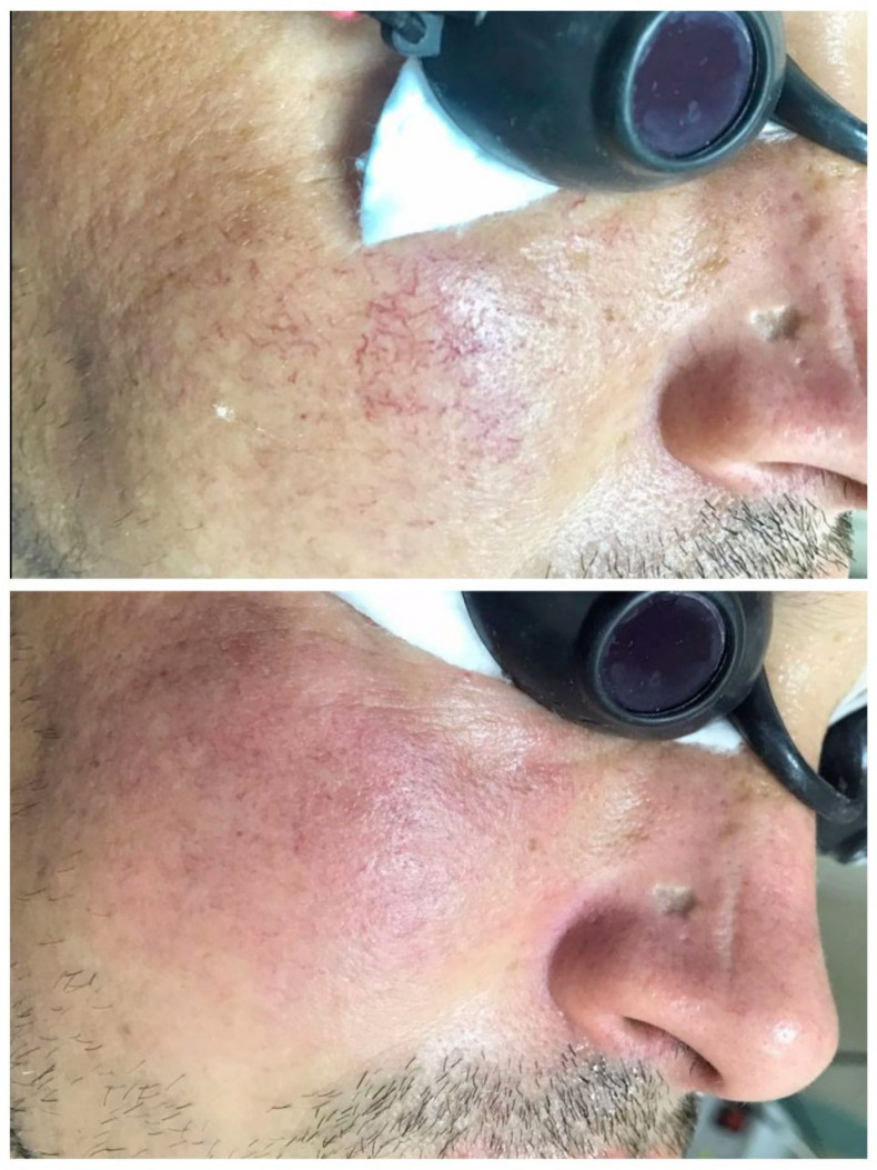 Суть процедури наступна: ділянку обробляють маніпулою лазера. Вона генерує промінь, який діє на проблемні капіляри. Гемоглобін поглинає енергію, тож кров нагрівається і згортається, а стінки склеюються. Згодом судина розчиняється, а її складові виводяться через лімфатичну систему. Поверхня шкіри стає світлішою. За допомогою лазера можна усунути сині та червоні дефекти різних розмірів. Крихітні зірочки іноді зникають після 1-2 сеансів. Для боротьби з розгалуженими сітками потрібен повний курс.
