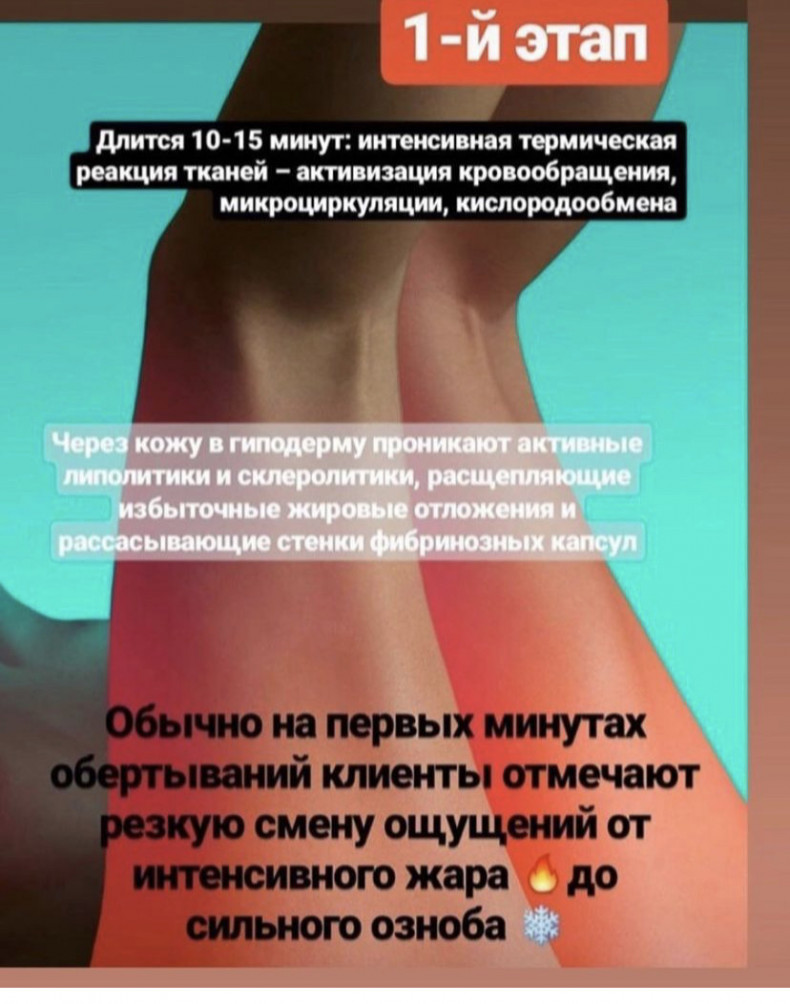 Для максимально быстрого достижения цели рекомендуем совмещать данную процедуру с массажем и/или виски-пеленанием. (Курс массажа дополняем обертываниями)