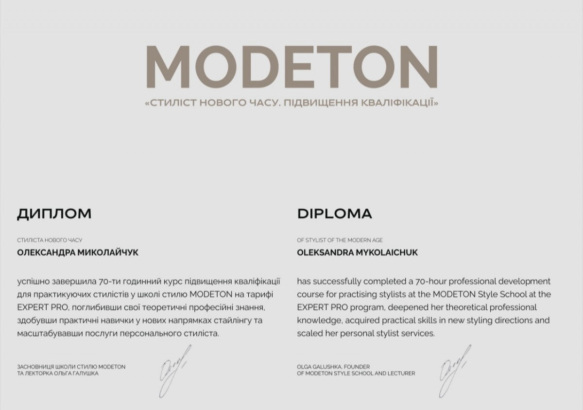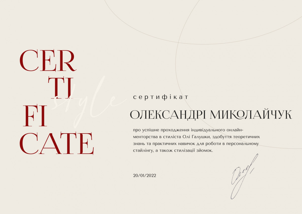 Вітаю! Мене звати Олександра Миколайчук і я пропагую SMART-підхід до створення власного стилю та гардеробу, охоплюючи такі аспекти, як самовираження, комбінаторика речей, автентичність, раціональність, експерименти та "фішки".