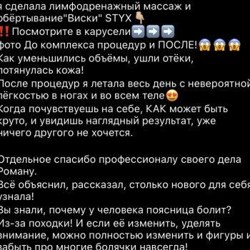 По запросу даю комплекс рекомендаций по индивидуальной коррекции и устранения проблем в теле. Результат после первой процедуры! Мой главный инструмент - это сильные, и в тоже время чувствительные руки.