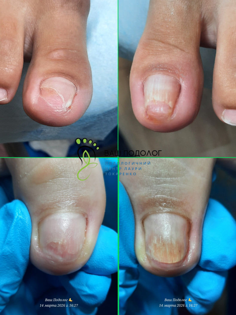 Лікування ще триває, але результат уже дуже радує: ніготь більше не вростає, зникла жовтизна, порожнеча під нігтем значно зменшилась 👍