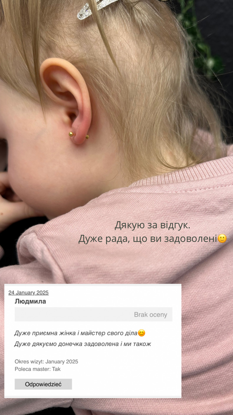 Ми у захваті)) Наталія просто Фея для маленьких дівчаток))) наша доця вже мала досвід прокалювання вушок та знає, що ще процедура не зовсім приємна, при цьому дала Наталії зробити прокол) і тільки трішки всхліпнула)) щіро дякуємо за гарні вушка з двома сережками)