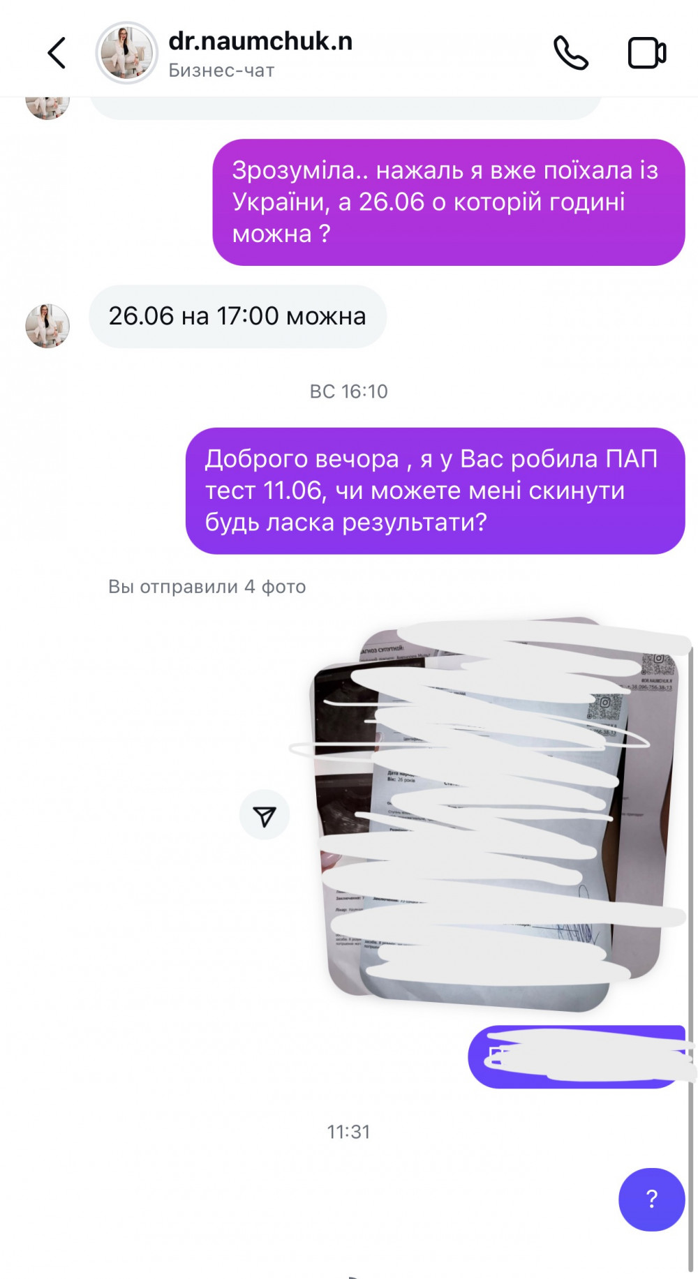 Я здала всі аналізи, відправила їй результати у вигляді фото — жодної підказки чи навіть припущення, що зі мною може бути. Тільки знову пропозиція записатися на платний прийом, який коштує чимало. У результаті я просто витратила час і гроші, не розуміючи, навіщо взагалі приходила, бо жодне питання так і не було вирішене. Я також здала ПАП-тест, результат якого треба чекати два тижні. Зараз уже тиждень день, як термін очікування пройшов,і 4 день як я написала їй повідомлення, що чекаю на результат, але від неї жодного повідомлення про результати. Після того, як гроші отримані, жодної комунікації немає — клієнт більше не цікавий.