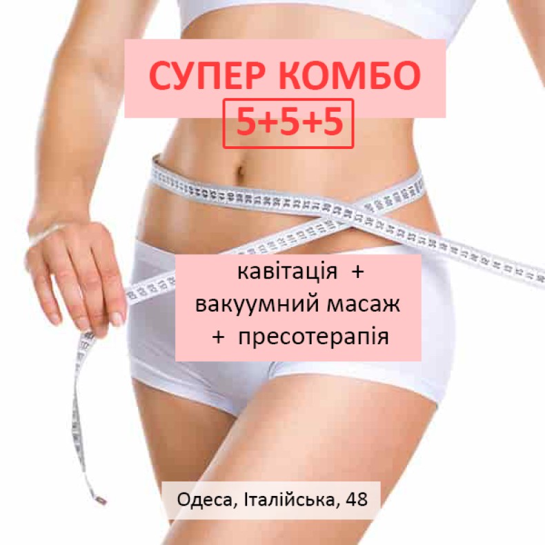 5 кавитації по 30 хв + 5 вакуумних масажів по 30 хв + 5 пресотерапії по 30 хв