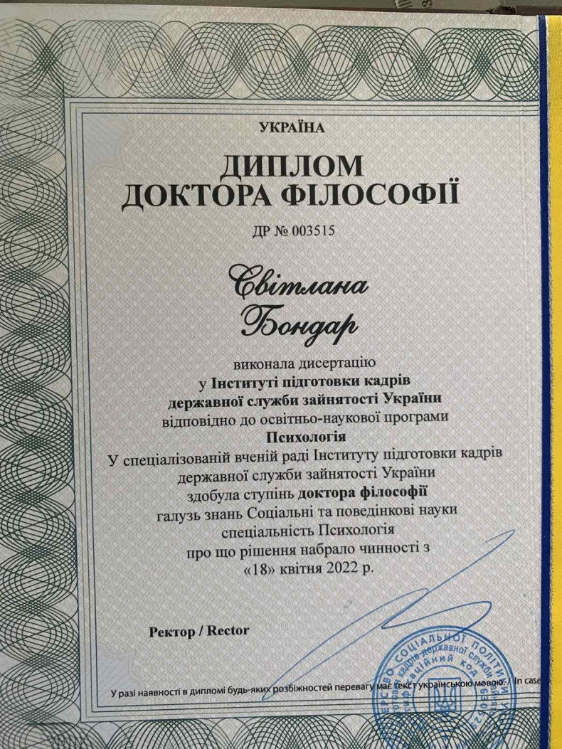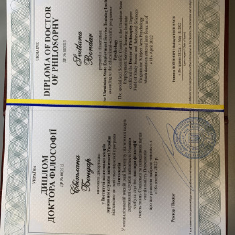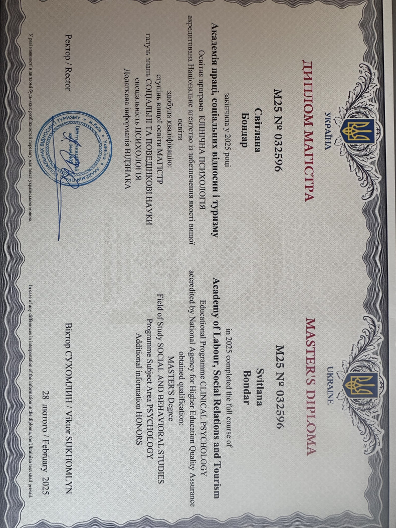 Приветствую. Меня зовут Светлана. Я психолог, гештальт-терапефт, психодраматист. Имею степень доктора философии по психологии Phd. Приглашаю Вас на онлайн-консультацию! В результате психологического консультирования Вы сможете лучше слышать себя, повысить сознание, увидеть скрытые потребности и чувства, исследовать места, где страшно, стыдно и тревожно. Получите навыки и умение чувствовать свою ценность, свободу от "должен", смелость встречаться и принимать новый опыт, отстаивать свои границы, услышать и понимать в себе чего "я хочу" и достичь этого. Работаю также с паническими атаками, травмами и постравматическими синдромами. Имею опыт кризисного консультирования в военное время. Гарантирую безопасное и конфиденциальное пространство. Буду рада Вам помочь!