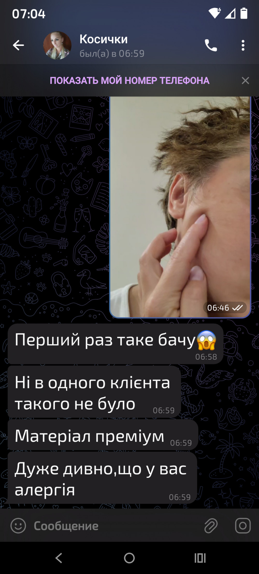 Заплатила 3000грн ,що ввечері зрізати все. Плела у неї на селі,казала матеріал преміум клас....але у мене з'явилась жутка алергія,коли в мене її ніколи не було. Тепер лікуюсь у лікарні. На що Олена ві дповіла......дуже дивно.....і все!.