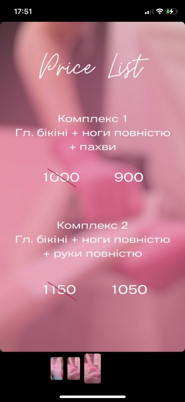 Гл бікіні+ ноги повністю+ пахви(повна ціна 1000 грн ),якщо робити комплексом =900 грн
