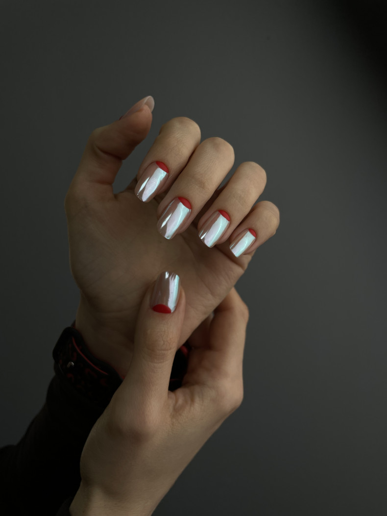 Металлический акцент: Используйте металлический лак в качестве акцента на некоторых ногтях. Например, выделите один или два ногтя, нанеся металлический лак, а на остальных ногтях используйте другой цвет или дизайн.