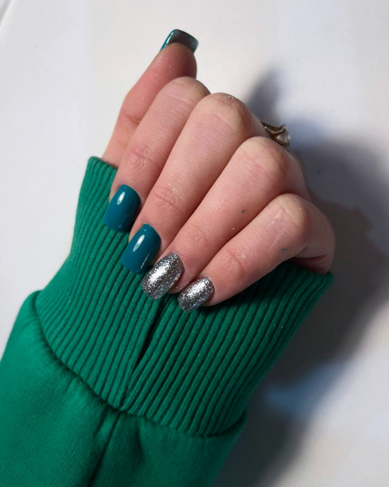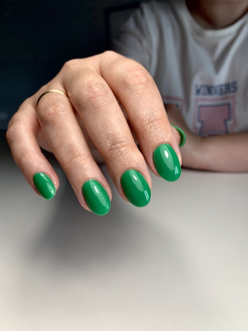Зеленый маникюр подходит для любого аутфита – повседневного, офисного, нарядного, придавая ему стильность и свежесть.