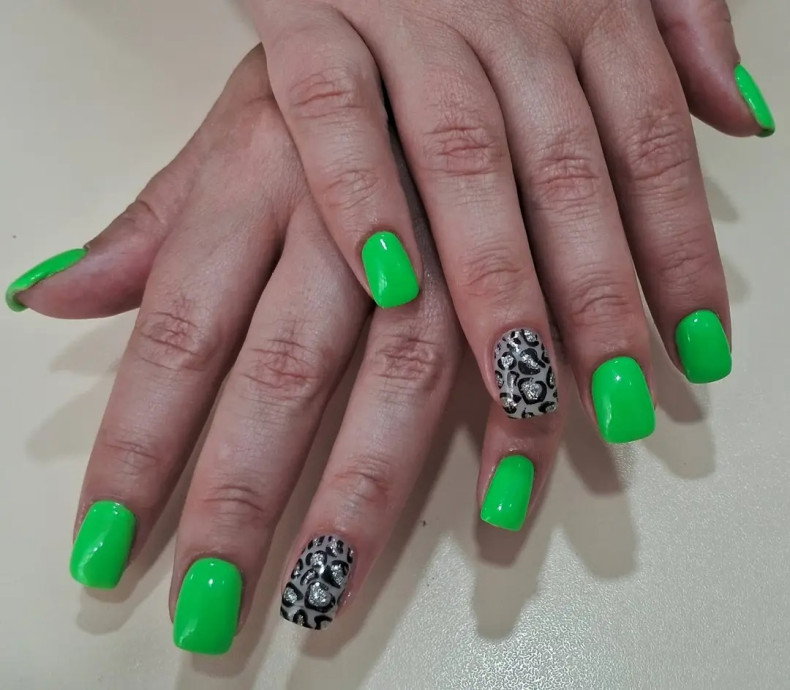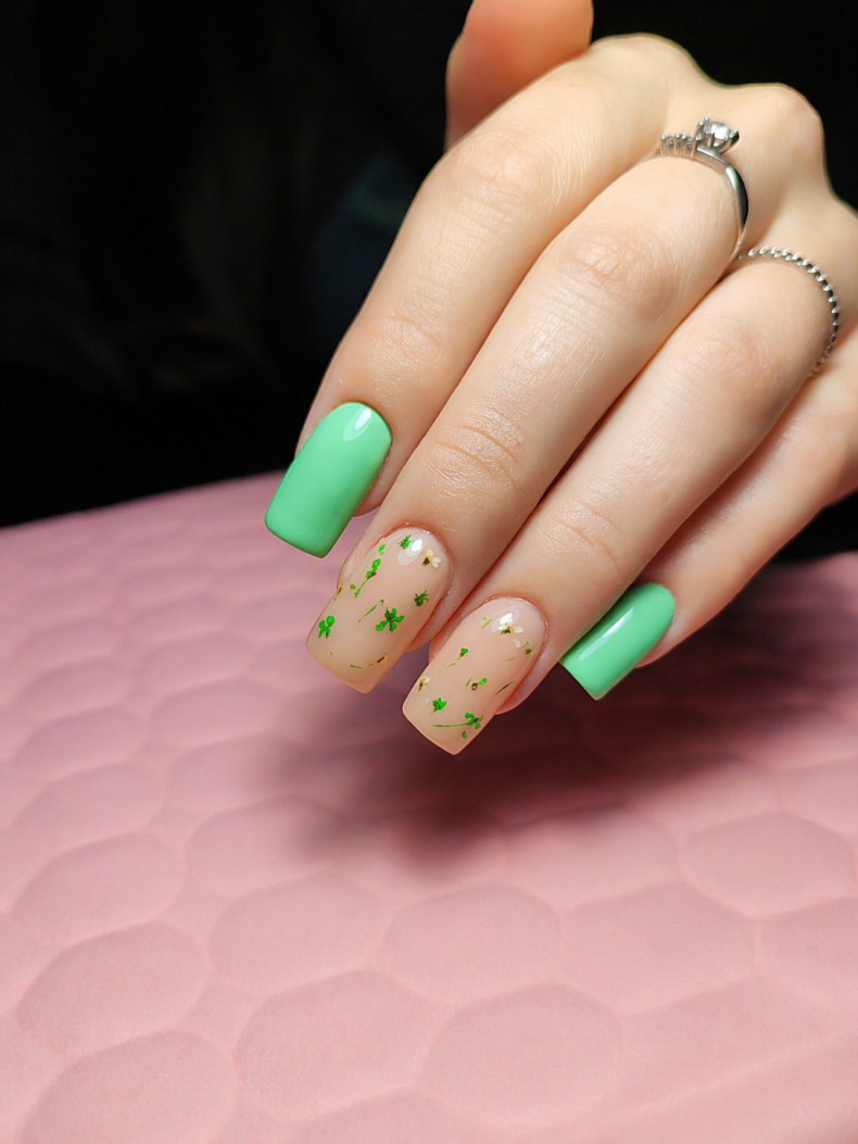 Зеленый цвет – непростой в сочетании с другими оттенками в нейл-арте. Поэтому для маникюра следует осторожно выбирать варианты рисунка и фона: