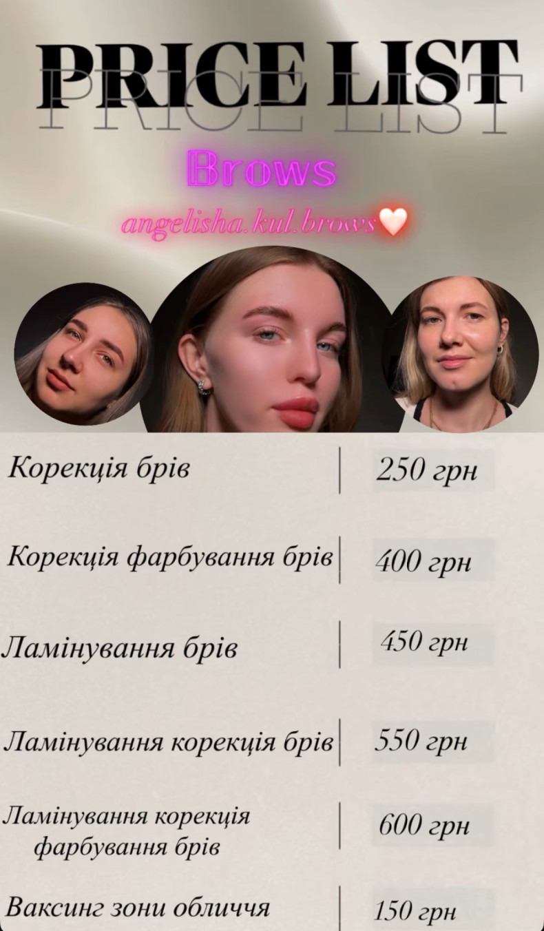 Привіт! Мене звати Ангеліна, я бровіст 💫 Допомагаю підкреслити природну красу та зробити твої брови доглянутими, акуратними й ідеально підібраними саме під твоє обличчя Працюю з такими послугами: ✨ корекція брів ✨ фарбування ✨ ламінування брів Для мене важливо, щоб ти почувалась впевнено та задоволено результатом 🫶 Працюю акуратно, з любов’ю до своєї справи та використовую якісні матеріали. Буду рада бачити тебе у себе на процедурі...
