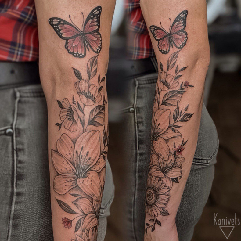 Тату-бабочка часто сочетается с цветочными и растительными мотивами. Более брутальный вариант – оформление в тёмных тонах, включение в эскиз мистических элементов (черепа, глаза, оккультная символика).