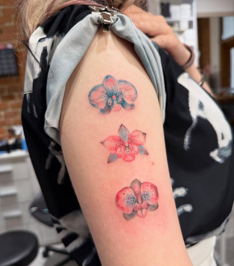 Тату, на котором изображена орхидея, оформляется в яркой цветовой гамме. Мастера обращаются чаще всего к стилям реализма или акварели. Орхидея изображается на таких татуировках в розовых, пурпурных или сиреневых оттенках.
