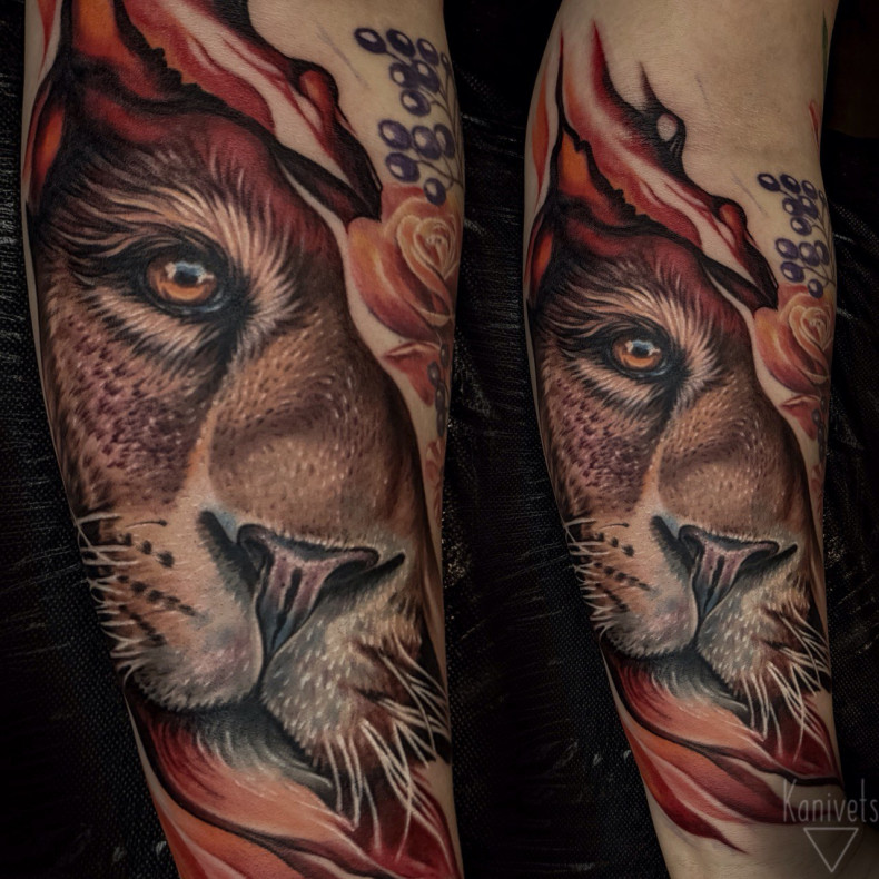 Изображение царственного зверя символизирует силу, благородство и авторитарность. Татуировка презентует человека как сильную и яркую личность, которая способна отстоять свои интересы. У женщин изображение львицы говорит о страстном темпераменте, но в то же время верности семье.