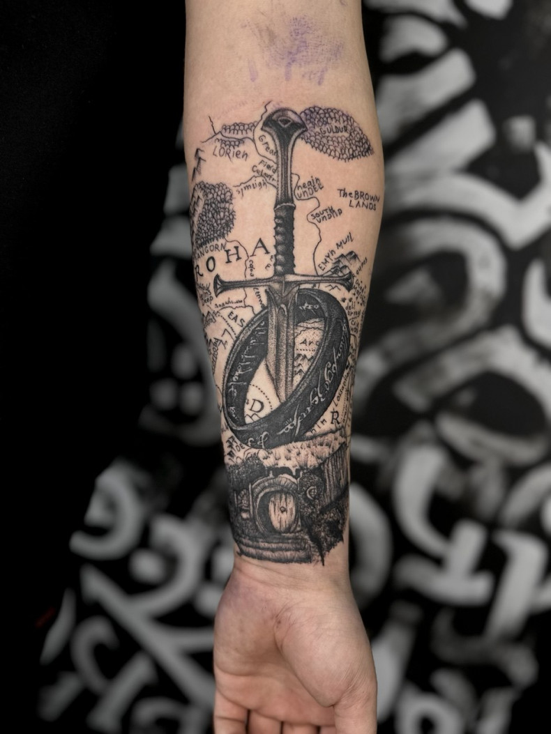 Когда же нужно придать рисунку больше мистичности и создать имитацию старинной гравюры, мастера обращаются к стилю black&gray или випшейдинг. На них тщательно прорисовываются все тени и узоры на рукоятке меча, а эскиз дополняется оккультными символами и свитками с надписями.