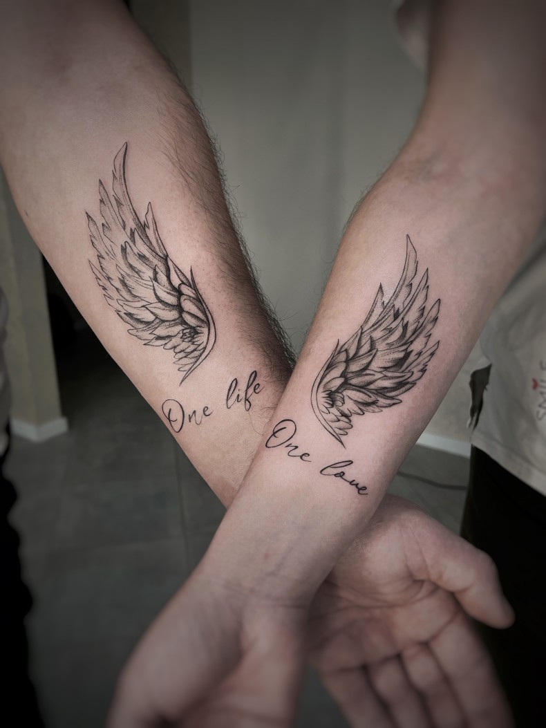 Что касается стилей нанесения, то часто выбирают минимализм, винтаж или традишнл. Нередко это надпись — одно слово или целое предложение. Большинство эскизов выполнены в черно-белом варианте. Нередко рисунки бывают сюжетными — одинаковыми или дополняющими друг друга. Стиль можно выбрать любой, главное — выполнять пару татуировок в общем стиле.