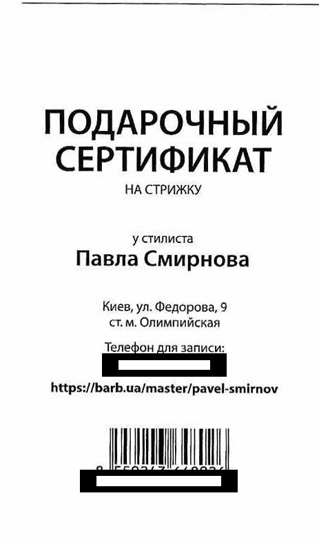 Подарочный сертификат на стрижку к стилисту Павлу Смирнову - отличный подарок для коллег, родных и близких. Основная особенность подарочного сертификата - он без срока давности. Любой обладатель данного сертификата может воспользоваться им в салоне. Для корпоративных клиентов есть специальные скидки по приобретению данного вида сертификата. Прайсовая стоимость данного сертификата 2000 гривен.