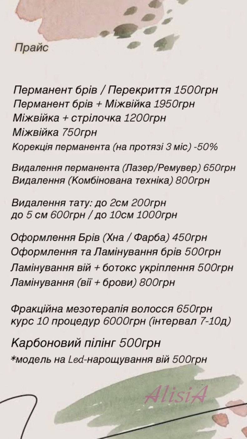 Дякую майстру Алісі, вона чудовий спеціаліст. В мене був старий татуаж бровей який я до цього видаляла у інших майстрів більше року і без результатно було. Але коли звернулася до Аліси вона довго консультувала та пояснювала які є методи видалення і які підійдуть конкретно у моєму випадку, і вже за 3 сеанси в мене практично нічого не залишилось, я дуже-дуже вдячна! Наразі планую робити новий перманент теж у Аліси.
