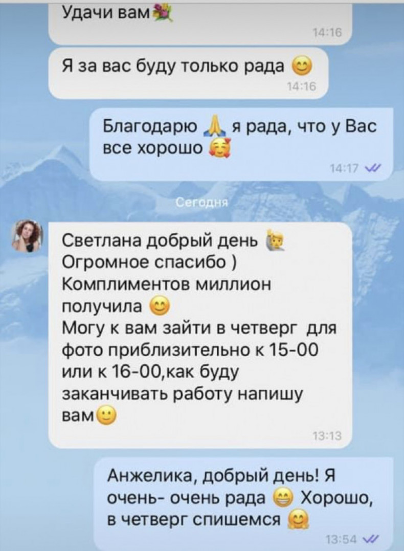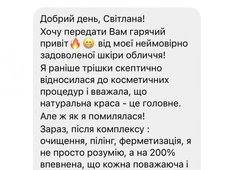 При поиске косметолога в интернете попала на Светлану, посмотрела отзывы клиенток, посмотрела прайс услуг. Позвонила Светлане и очень обрадовалась, что смогу к ней попасть уже на следующий день) Прийдя на процедуру(чистка лица) я встретилась с очень обаятельной и приятной в общении Светланой, очень классная энергетика идёт от неё. Рассоабляющая музыка, её волшебные, мягкие руки погрузили меня в состояние какой-то нирваны) Обстановка была лёгкой, расслабляющей и очень приятной не только для лица, но и для души)) Очень благодарна Светлане за её обаяние и профессионализм)