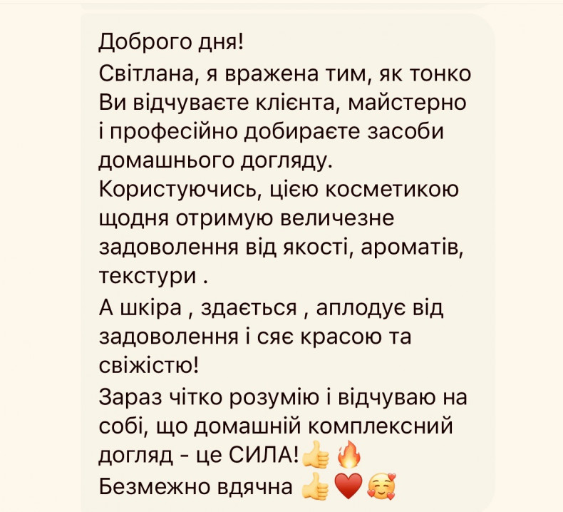 Я — косметолог із медичною освітою, з 2012 року присвячую себе мистецтву збереження краси. Пропоную професійний догляд за шкірою обличчя в атмосфері тепла, спокою й гармонії, під ніжну, розслаблюючу музику, що дарує внутрішній баланс і умиротворення.