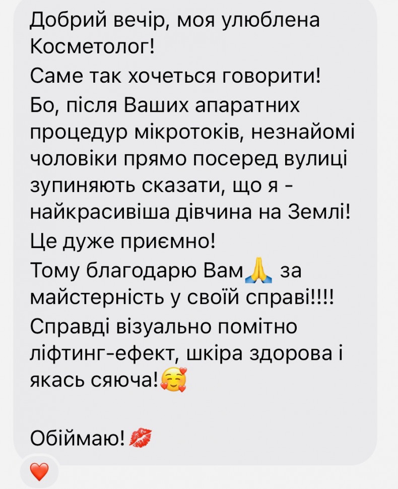 Масаж обличчя має приголомшливий ефект. Обличчя свіже, шкіра підтягнута. А найкраща оцінка роботи це знайомі які просять контакт майстра з чарівними ручками.
