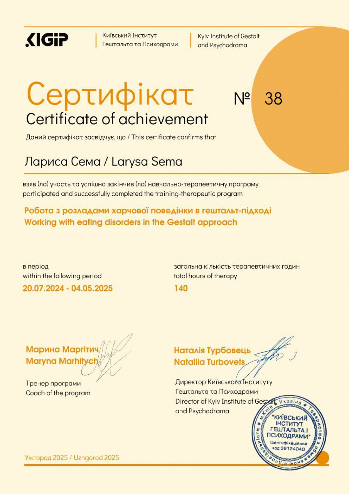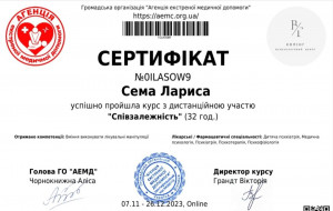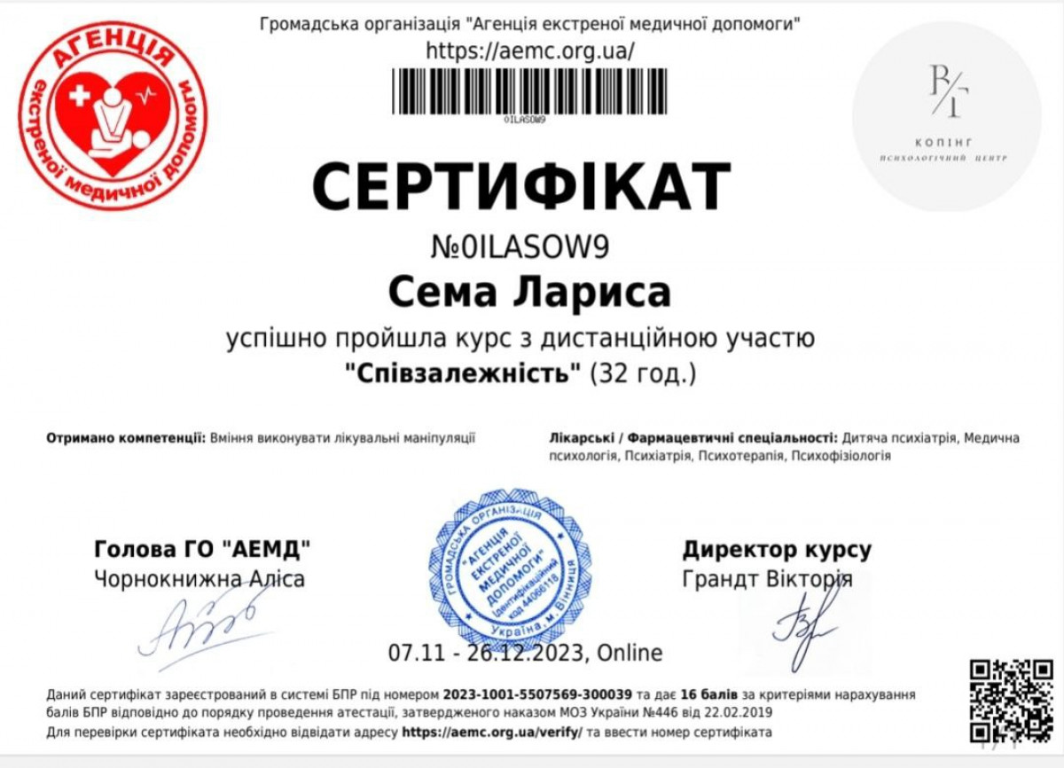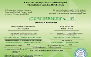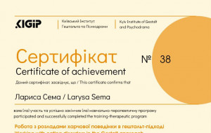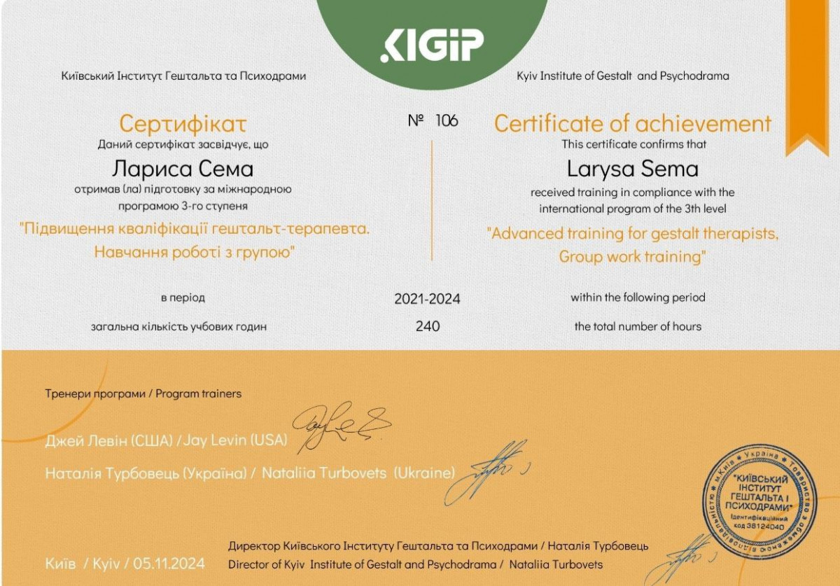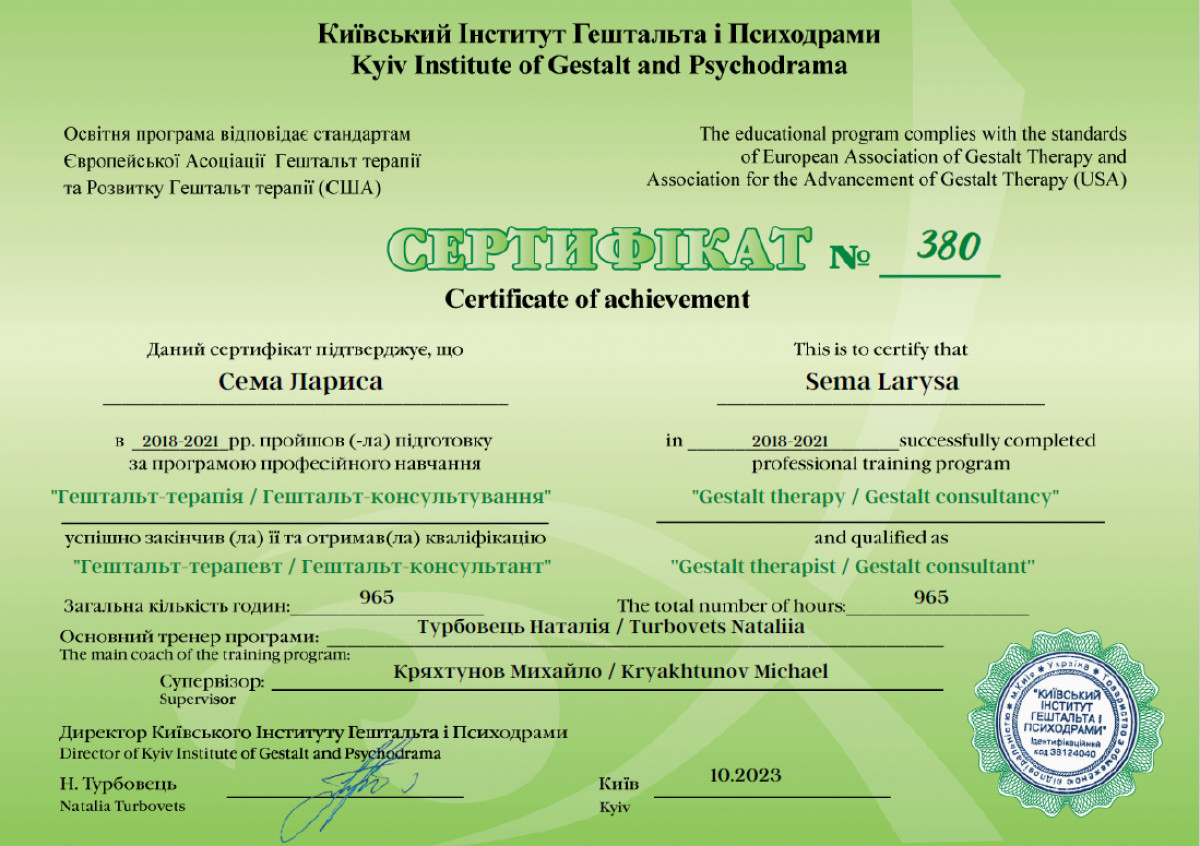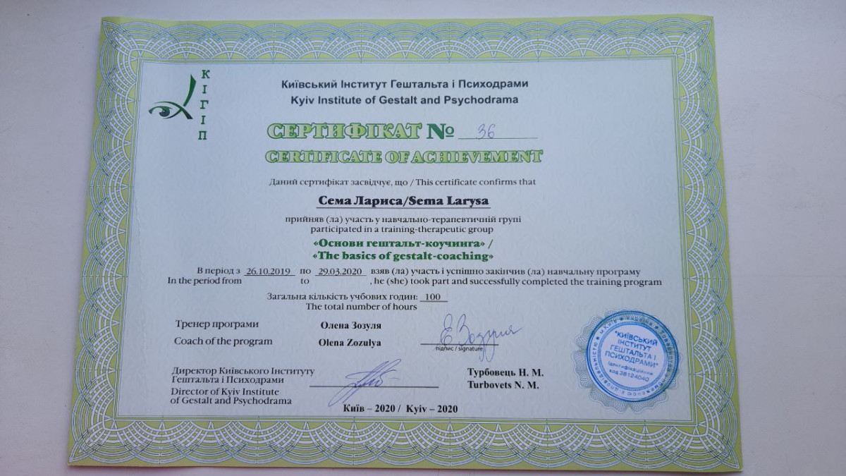 Вітаю! Мене звуть Лариса. Я психологиня, сертифікована психотерапевтка. Практикую гештальт-теерапію і гештальт-коучинг. Із власного досвіду знаю, як важливо щоб спеціаліст був професіоналом своєї справи. Тому я навчалася і практикуюся у кращих психотерапевтів України, США, Європи. Також маю магістерський ступінь з психології. Постійно підвищую свою професійну майстерність, маю особисту терапію та супервізію.
