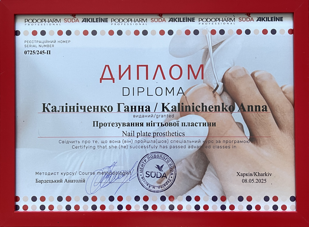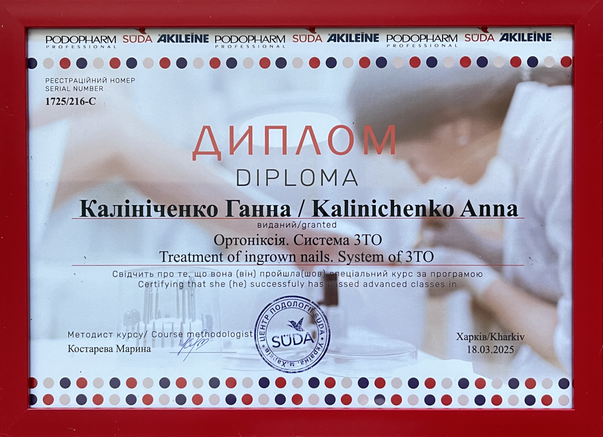 Мене звати Ганна і моя робота — допомагати людям зберігати здоров’я та красу стоп. Я — подолог 🦶🏻, який спеціалізується на комплексному догляді за стопами та нігтями. У своїй роботі поєдную медичний підхід, сучасні методики та уважне ставлення до кожного клієнта. Моя мета — не лише усунути існуючі проблеми, такі як 👣 врослі нігті, 👣 тріщини, 👣 натоптиші, 👣 мозолі чи 👣 грибкові ураження, але й допомогти запобігти їхньому повторному виникненню. Я приділяю особливу увагу стерильності інструментів, комфорту та безпеці, щоб кожен відвідувач почувався захищено та впевнено.