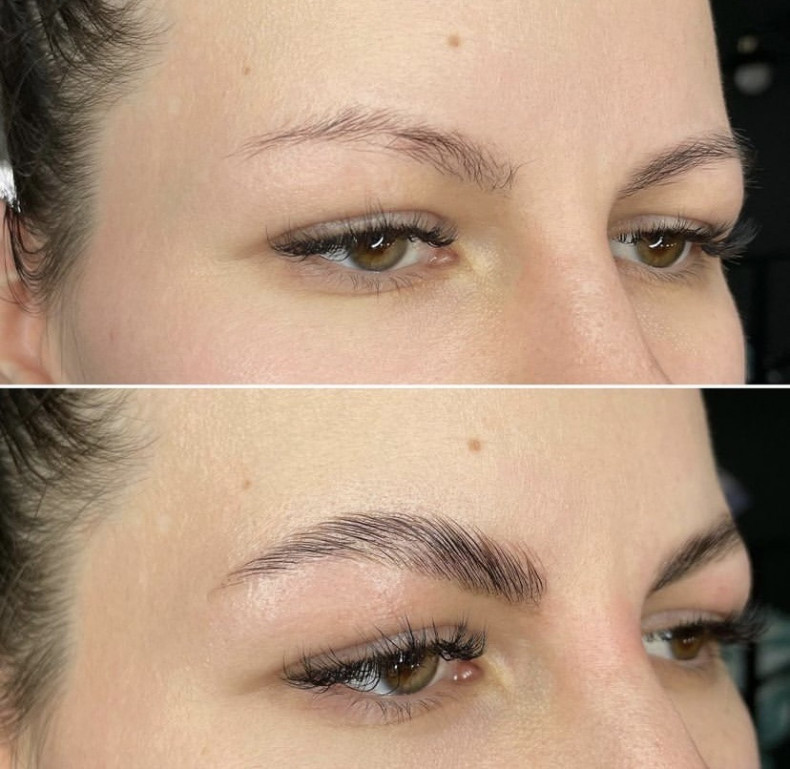 Нанесение двух составов для долговременной укладки бровей. Окрашивание краской. Коррекция пинцетом и нитью. Увлажнение и питание третьим составом.